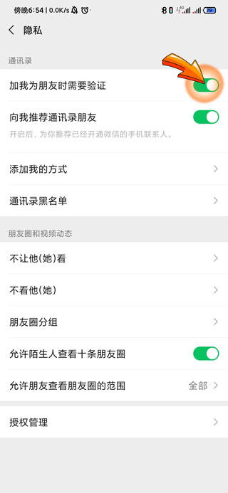 4、进入后首选将最上方的“加我为朋友时需要验证”右侧的开关打开,使开关颜色为绿色。