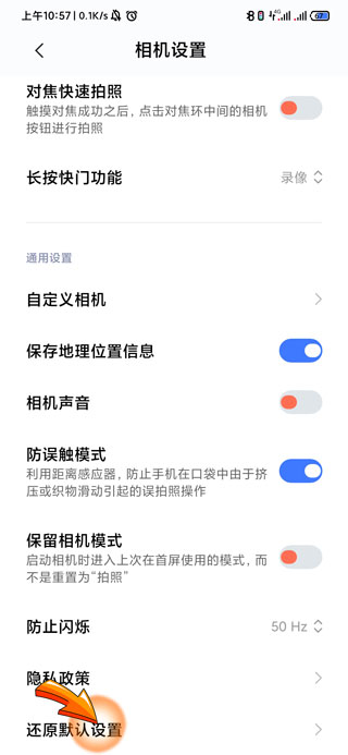4、将出现的页面向上滑动到最底部,点击“恢复默认设置”,将相机进行重置。