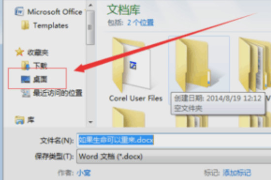 3、点击对话框左侧的“我的桌面”,再更改wps文档的文件名和文件类型,之后点击对话框中的“保存”,wps文档就会被保存在桌面上。