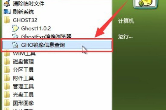 登录到大白菜pe系统桌面,点击开始菜单,再点击打开GHO镜像信息查询。