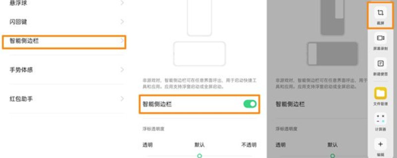 oppo reno4 pro手机截图可以依次点击设置、便捷辅助、智能侧边栏并打开按钮,截屏时划出侧边栏,再点击截屏就可以。此外也可以在手机需要截屏时,同时按oppo reno4 pro手机的电源键和音量减键并停留一秒左右,手机也可以截屏。
