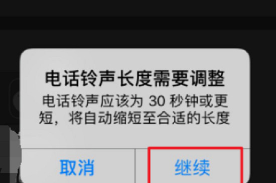 3、在共享的界面,选择页面中的电话铃声选项,会弹出调整铃声长度的提醒,点击继续。