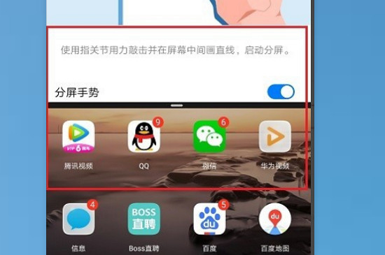 4、开启了分屏手势之后,可以使用指关节在屏幕中间滑成一条直线,启动分屏。分屏启动后,可以同时在屏幕两边进行操作应用。