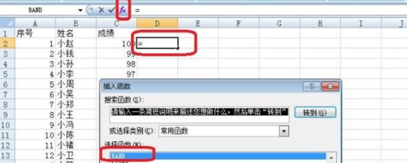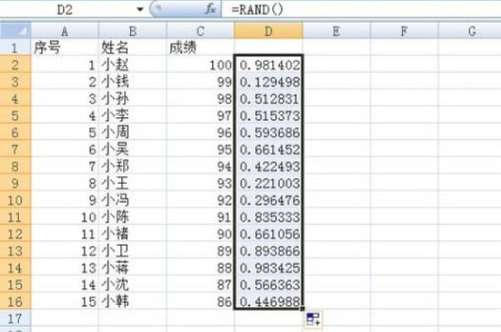 2、选择随机函数“RAND”并点击确定,这个位置会被赋予一个0~1之间的随机值。从D3单元格下拉进行填充,里面各个单元格也都会插入随机值。