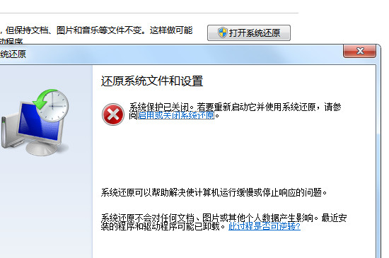 2、进入系统还原界面后,点击界面中的“还原计算机或重装windows”。之后用鼠标左键单击“打开系统还原”,再点击“启用或关闭系统还原”。