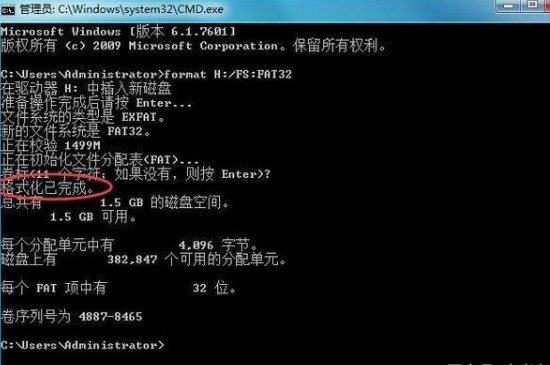 3、指令输入完成后,按下回车键,系统就会自动对u盘进行格式化。格式化完成后,系统会提示“格式化已完成”,这时u盘也就可以正常使用了。