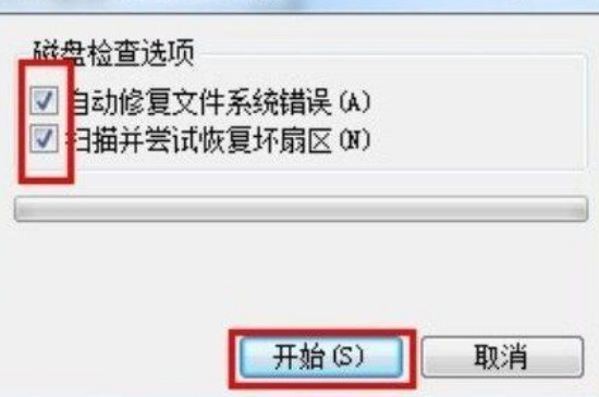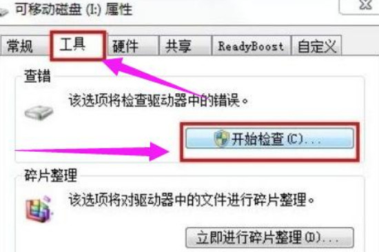 3、在打开的窗口中点击“工具”,再点击“开始检查”按钮。界面再次弹出新的窗口后,同时勾选窗口中的两个选项,最后点击“开始”即可自动检查并修复u盘。
