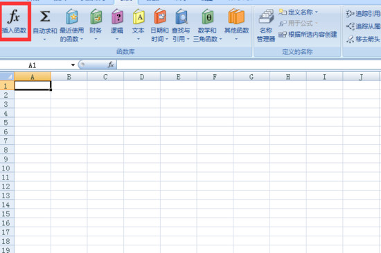 3、点击Excel表格功能区域中的公式,接着点击公式功能区面板的插入函数。