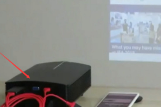 2、将转接线插入到投影仪上面后,再把手机线插到转接线上面,投影仪和手机的连接也就完成了,这时可以通过手机输送影像至投影仪来播放。