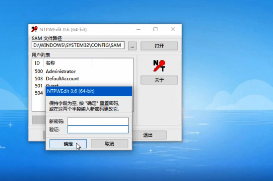 3、将电脑主机重启并在开机界面按下启动热键,之后用方向键启动U盘,选择win10PE进入PE后,打开密码修改并点击“打开”,选择正在使用的账户后,点击“更改密码”,密码更改完成后点击“确定”、“保存更改”,最后重启电脑即可。