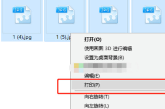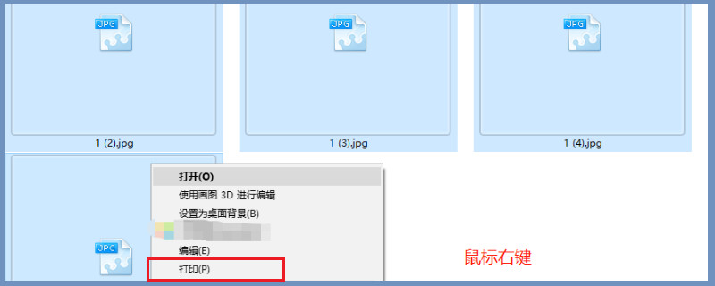 2、鼠标光标移动到文件夹空白区域后,单击鼠标左键并选中所有需要打印的图片,之后单击鼠标右键,再选择新弹出选项框中的“打印”选项。