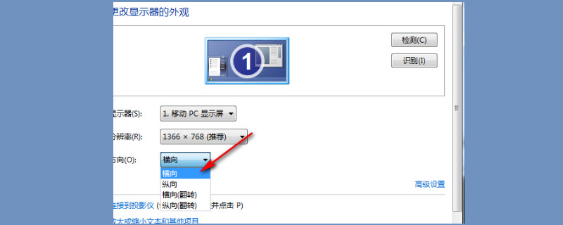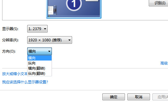 3、找到页面中的“方向”栏目后,鼠标左键单击方向栏目右侧的倒三角图标,之后点击下拉菜单中的“横向”,再点击“确定”选项,屏幕的文字即可恢复正常。