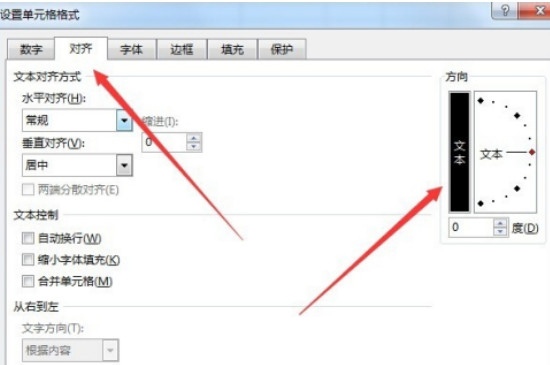 2、在设置单元格格式界面内点击“对齐”栏目,之后在打开的对齐设置页面内将“方向”设置框设置成竖排,最后点击确定,就可以看到单元格内的文字变成竖的了。