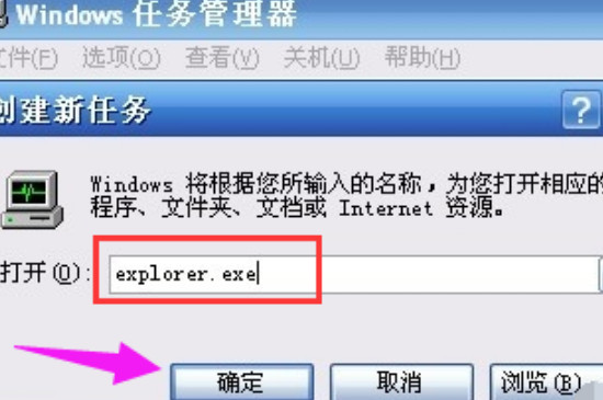2、找到电脑任务管理器上面的“文件”后,再点“新建任务”,之后在弹出的窗口内输入“explorer.exe”,电脑的显示栏就会恢复。