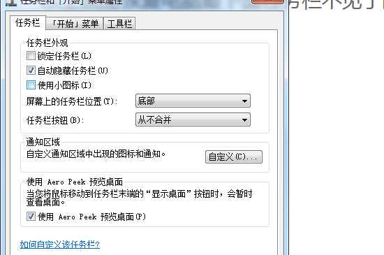 3、此外电脑显示栏不见了还可能是因为设置了“自动隐藏任何栏”,鼠标移动至电脑桌面底部时,显示栏就会出现。而鼠标离开桌面底部时,显示栏就会消失。