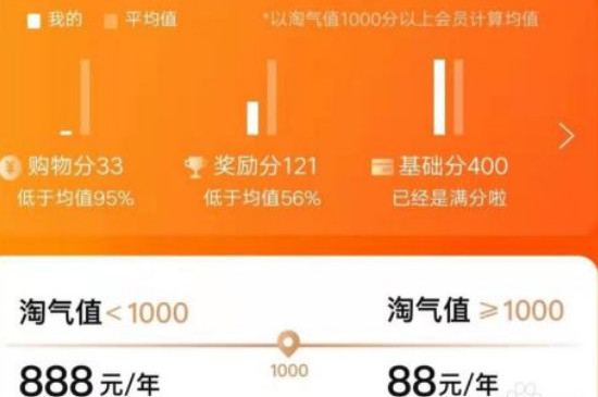 如果用户的淘气值达到1000分,则可以享受88元开通88VIP的优惠活动。但是想要提升淘气值时,最直接的方法是经常购物,在淘宝上购物越频繁,购买的金额越大,淘气值就会增加的越多。