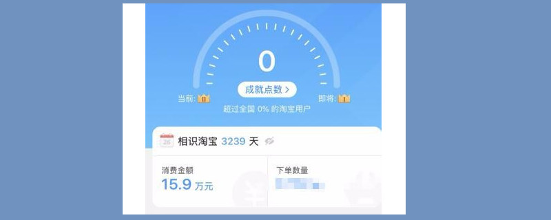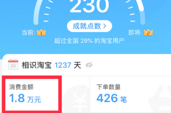 3、进入淘宝人生成就页面后,页面就会显示在淘宝共花费的金额、注册淘宝的天数、下单的数量,以及在淘宝获得的成就点数等多种信息。