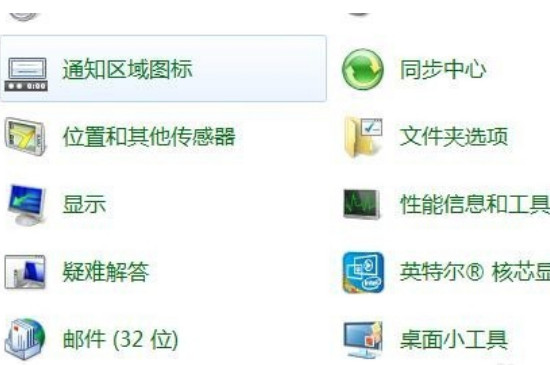 2、进入控制面板界面后,界面内会显示“通知区域图标、同步中心、位置和其他传感器、文件夹选项、显示、字体、性能信息和工具”等多个选项。