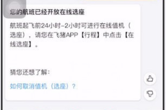 2、在航班起飞前24小时~2小时以内会开放在线值机,这时飞猪APP会发送相应通知,之后按照相关的提示进行操作,就可以办理在线选座的服务。