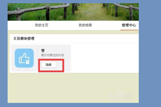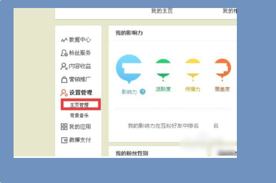 进入设置管理之后会有主页管理的选项,点击进入主页管理的界面。这时就会出现一个大拇指图案,图案旁边会有隐藏的选项,点击隐藏即可,注意手机上的客户端也是无法设置的,要进入手机中的网页微博才行。