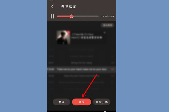 找到本地录音后并点击就可以看到已经保存好的本地录音,这时点击录音进行预览,如果觉得录音不行可以点击重录后重新录制。确定歌曲无误后就可以点击下方的发布,这样自己的录音就可以上传了。