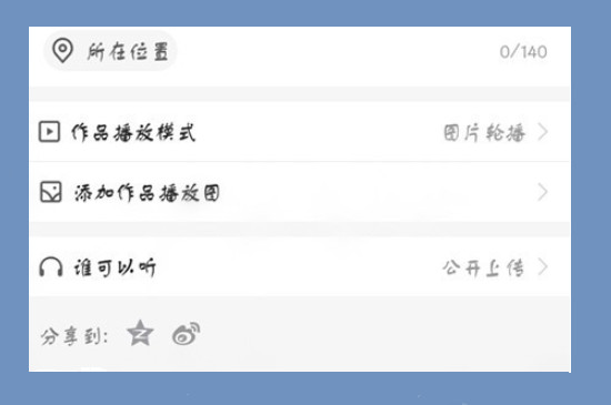在发布的同时可以配上图片,还可以点击作品的播放模式来确定图片的播放方式。最下方的谁可以见的选项可以设置公开上传或者屏蔽掉一些人,上传歌曲的位置也是可以更改的。