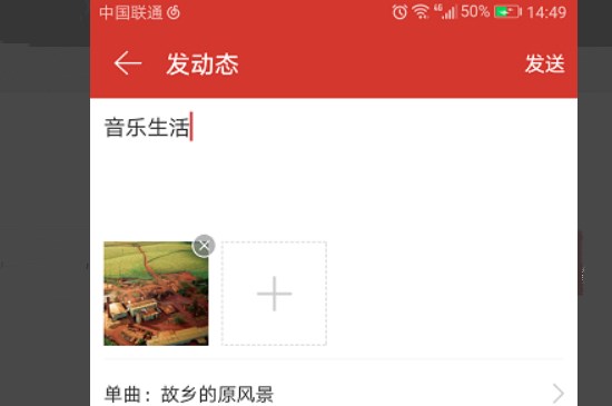 打开网易云app之后进入主页,点击主页下方的云村,进入云村广场之后选择发动态就可以进入编辑界面。输入文字以及图片之后,还可以配上音乐,编辑完毕后点击右上角发送。在动态列表刷新一下,此时就能看见自己的动态。