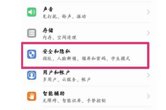 1、打开华为手机,进入设置,在此页面点击“安全和隐私”。