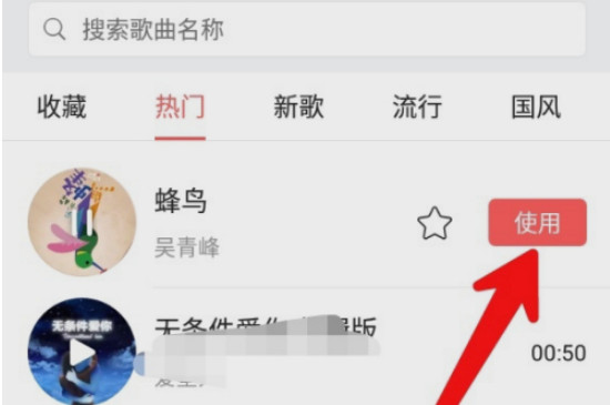 3、拍摄好后,右上角可点击“选音乐”,找到自己喜欢的歌曲,点击“使用”。