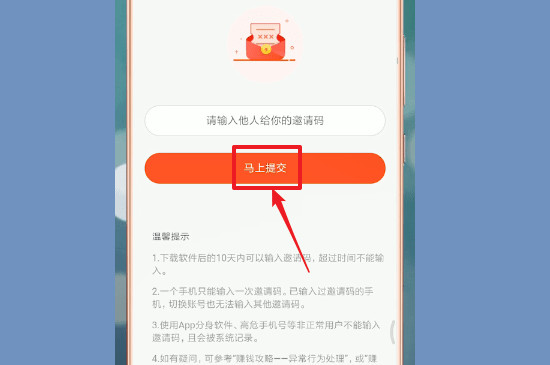 2、界面跳转后,可以看到输入邀请码字样的下面有文本框,将别人的邀请码粘贴进去,点击马上提交就完成了。注意别人的邀请码用过一次后是不能第二次使用的,每个人每天填写邀请码的次数是有限的,所以要谨慎使用。