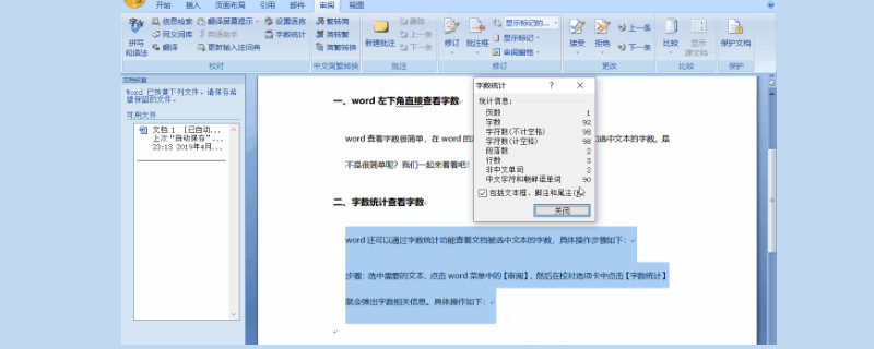 word看字数的方法有很多,可以先选中需要统计的文本,此时界面左下角就会显示字数。还可以点击审阅,打开字数统计之后查看更加详细的字数统计。如果是老版本的word文档,则需要打开工具栏中的工具,并点击字数统计查看字数。