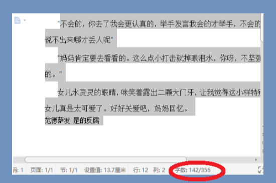 Word看字数的方法有很多种,可以直接按住鼠标的左键,在文字上面滑动,这时就会将文字选中,这时观察左下角就会显示出字数。注意Word统计的字数是没有将标点符号算进去的,字数的旁边也可以看见标点符号的个数。