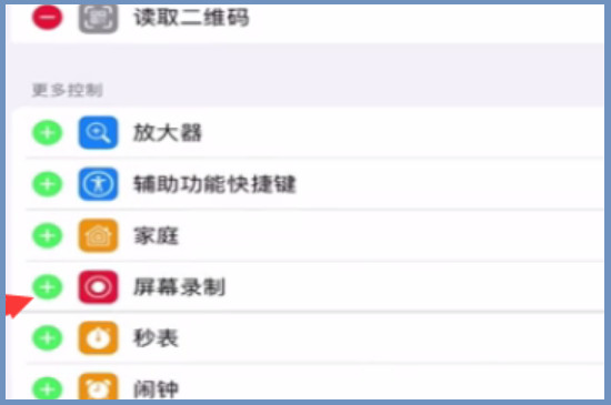 打开自定控制之后,在所有控制页面内找到并点击“屏幕录制”,并继续点击屏幕录制左边的加号键,这样就可以把屏幕录制设置在菜单栏。