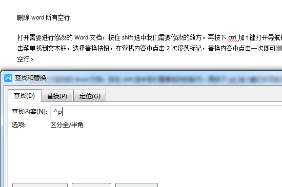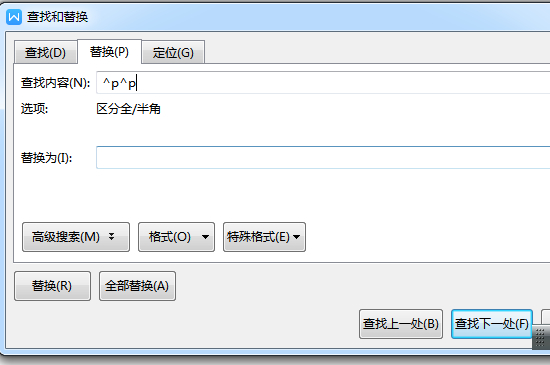 在打开的的对话框中,在查找内容框中输入^P^P,替换内容框中输入^P,确认后可以看到原本的空行少了一半,重复次步骤即可。