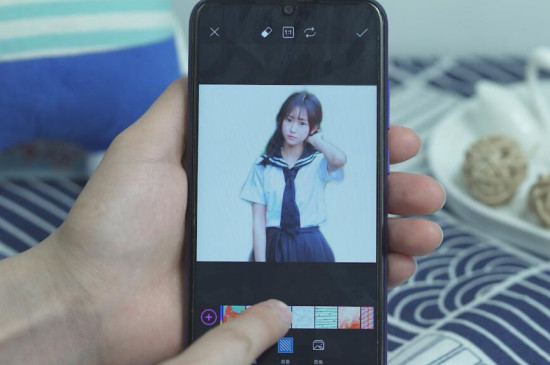4、最后在照片下方找到“背景”进行点击,然后在照片下方选择想要更换的底色。选择好颜色之后点击右上角的小勾保存,这样照片的底色就更换完成了。