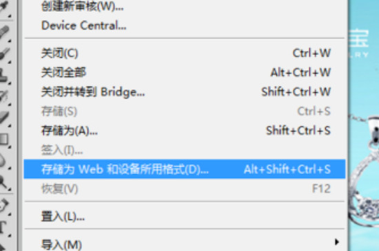 2、打开PS软件,然后点击PS左上角的“文件选项”,打开所需要更改的照片,随后点击“存储为Web和设备所用格式”的选项。