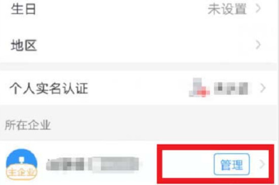 2、在打开的页面下方找到“所在企业”,之后点击需要注销的企业右侧的“管理”进入企业管理界面。在企业管理界面内会出现企业认证、安全中心、我的客服、管理员设置等多个选项,之后点击最下方的“更多设置”选项。