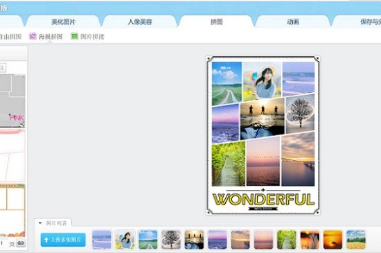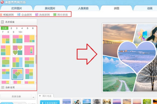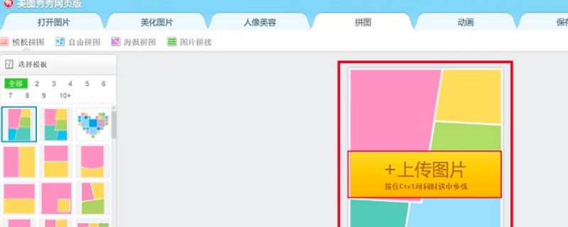 2、将所有需要拼在一起的照片上传后,美图秀秀界面左侧会提供常用的拼图模板,例如自由拼图、海报拼图、模板拼图、照片拼接等多种方式,之后点击需要的模板便可以直接预览拼图的效果。
