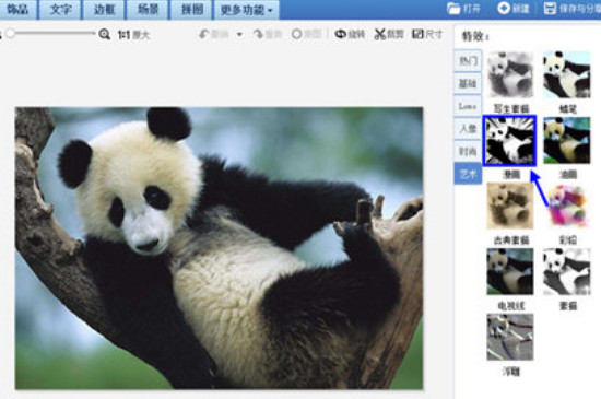 2、在美图秀秀界面右侧特效标签栏找到“艺术”并点击,再选择“漫画”选项,照片就会自动呈现出漫画的效果。之后调整漫画的百分比,可以改变照片漫画化的程度。
