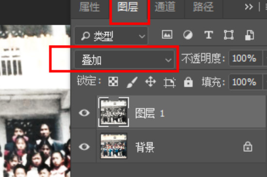3、将已经去色的图层的模式调整为“叠加”模式,以此来增加照片的色彩反差。