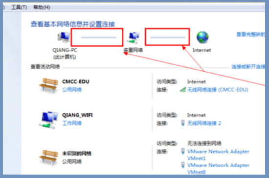 如果电脑突然不能上网的话也有可能是网卡驱动出现了问题,打开电脑之后右键信号格点击“打开网络和共享中心”,如果在电脑连接的位置出现了黄色感叹号就是连接问题,此时应该开启鲁大师重新安装网卡。