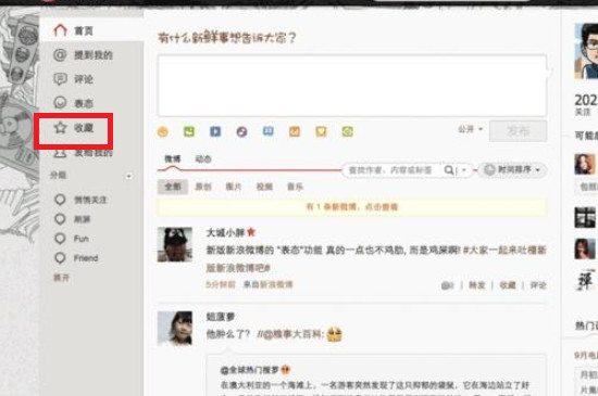 进入微博之后点击头像,此时进入个人页面后点击左边的“收藏”选项,这样就可以进入微博收藏的收藏夹。