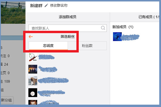 点击进入粉丝页面之后,选择左边群选项,此时继续点击右边的“新建群”就可以打开好友列表。此时跳转页面的筛选忠诚粉丝就是最近访问微博的访客,并且访问次数和好友排名也有关系。