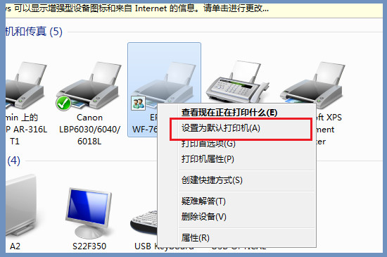 在选项页面点击“查看设备和打印机”之后等待页面的跳转,此时会话框弹开之后就可以看到目前电脑上连接的打印机设备,用鼠标右键选择新的打印机设备之后,在菜单栏内选择“设置为默认打印机”即可。