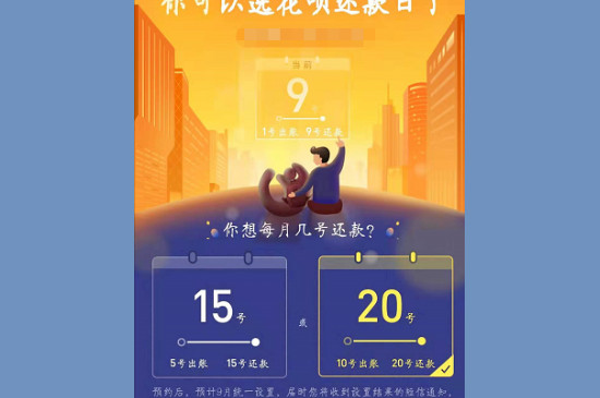 进入跳转页面之后就可以根据自己的喜好设置花呗还款日期,最上方会显示目前的花呗还款日期,可以选择15号还款或者20号还款。不过需要注意的是,目前花呗还款时间一年内只能设置一次,因此要慎重选择日期。