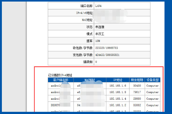 点击主页工具栏上方的“用户侧信息”,在左边找到“WLAN接口信息”之后点击“LAN接口信息”,下拉页面就可以看到目前连接到的设备。