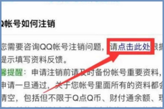 等待跳转页面之后会有连接提醒,点击页面内的“点击此处”之后就可以进入qq注销页面了,填写qq的相关信息之后就可以提交信息并且等待审核。注意填写信息的内容一定要真实,这样审核注销的速度就更快。