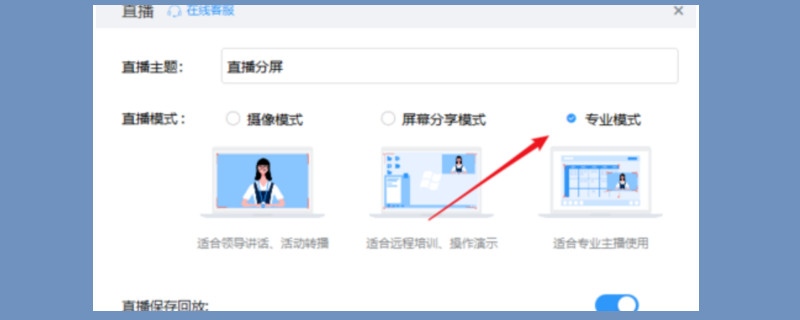 进入钉钉程序之后,打开群聊的窗口,可以在窗口看见一排操作按钮。点击形状像电视一样的那个按钮,就可以打开“发起直播”的选项,此时页面会跳转进入直播设置,将直播模式改变为“专业模式”。