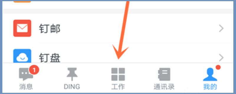 打开手机钉钉之后进入页面,进入主页面之后可以在屏幕下方看到五个分类,分别是消息、DING、工作、通讯录以及我的主页。在主页找到“工作”选项,点击工作之后就可以打开工作专栏内的内容。