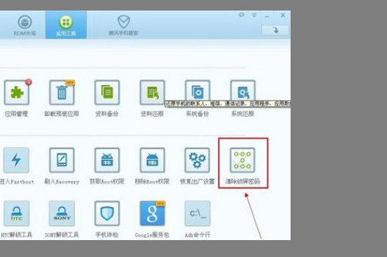 还有一种方法是在电脑上下载一个刷机精灵,用usb线连接电脑和手机之后,打开电脑的刷机精灵,点击右上角的“实用工具”,找到其中的“清除锁屏密码”就可以了。设置完毕后重启手机,再打开手机的时候就会发现手机的图案锁没了。
